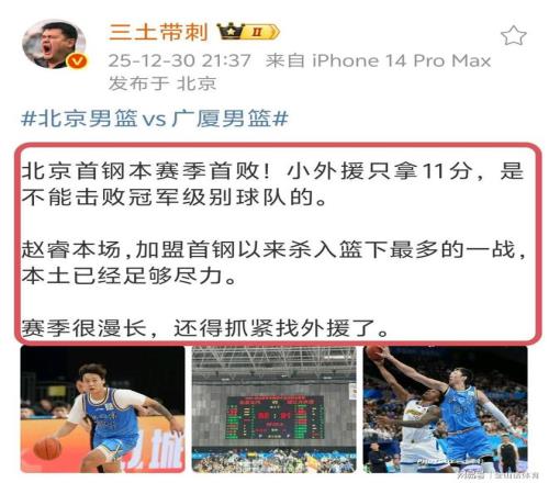 值得关注的是,北京队惜败广厦,4位媒体人,同时指出北京队一软肋,而这个软肋,正是当晚14中4的小外援杰曼。赛后,媒体人三土带刺发文表示:“北京首钢本赛季首败!小外援只拿11分,是不能击败冠军级别球队的。本场,加盟首钢以来杀入篮下最多的一战,本土已经足够尽力。赛季很漫长,还得抓紧找外援了。”。