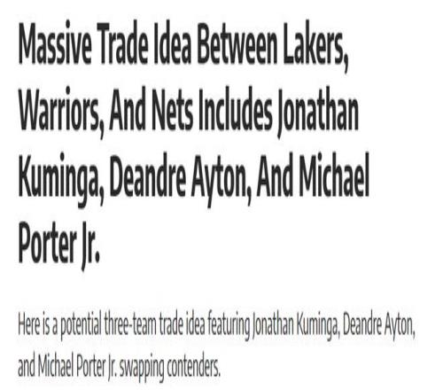 勇篮湖3方交易将达成,库明加辅佐东詹,波特辅佐库里,篮网赚了