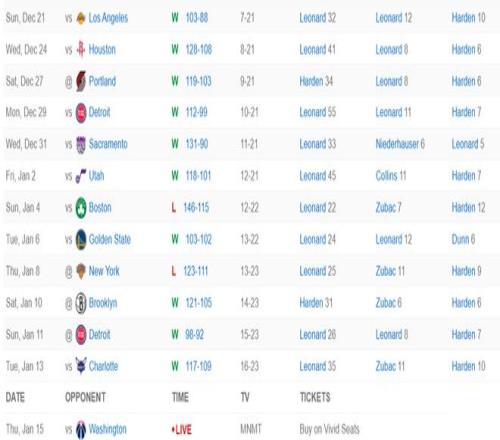 拒爆冷!快船胜奇才4连胜,哈登22分,伦纳德33分创59年队史纪录