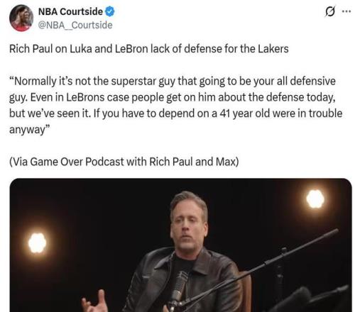 作为其经纪人的里奇保罗则在节目中公开为詹姆斯辩解道:“如果一支球队还想依靠41岁的老将来防守,那么这支球队肯定是遇到了大麻烦。”